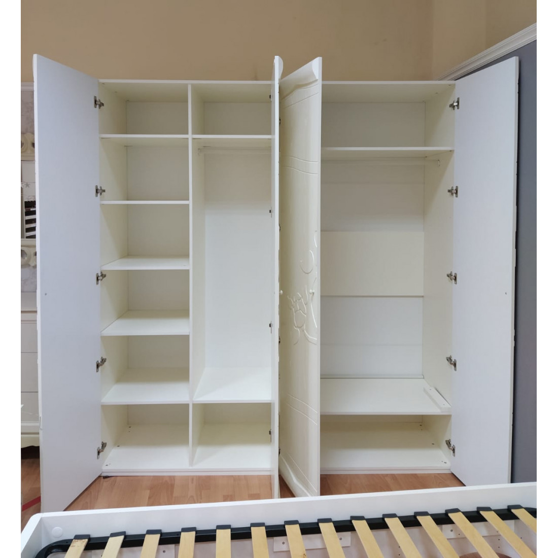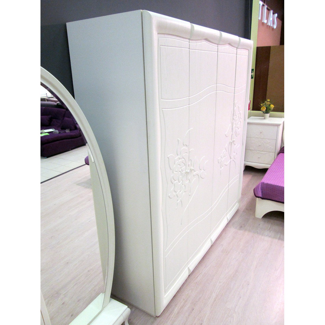Большой четырехстворчатый шкаф для одежды и белья МН-218-04-220 серии Астория от Мебель-Неман вместителен и функционален. Великолепно исполненная отделка, с оригинальным утолщением фасадов в виде обрамления и лазерной сверхточной резьбой изящного растительного рисунка подчеркивает неповторимость модели. Купить столь объемный гардеробный шкаф в спальню – значит навсегда решить проблему недостатка места для размещения постельных принадлежностей и одежды.