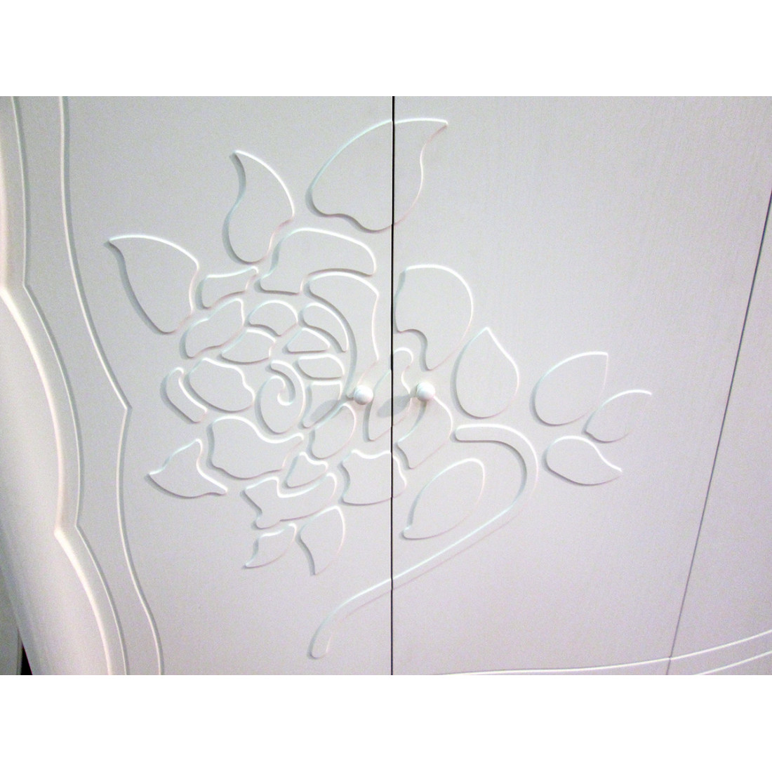- Фасад шкафов по периметру обрамлен массивной волнообразной рамкой.