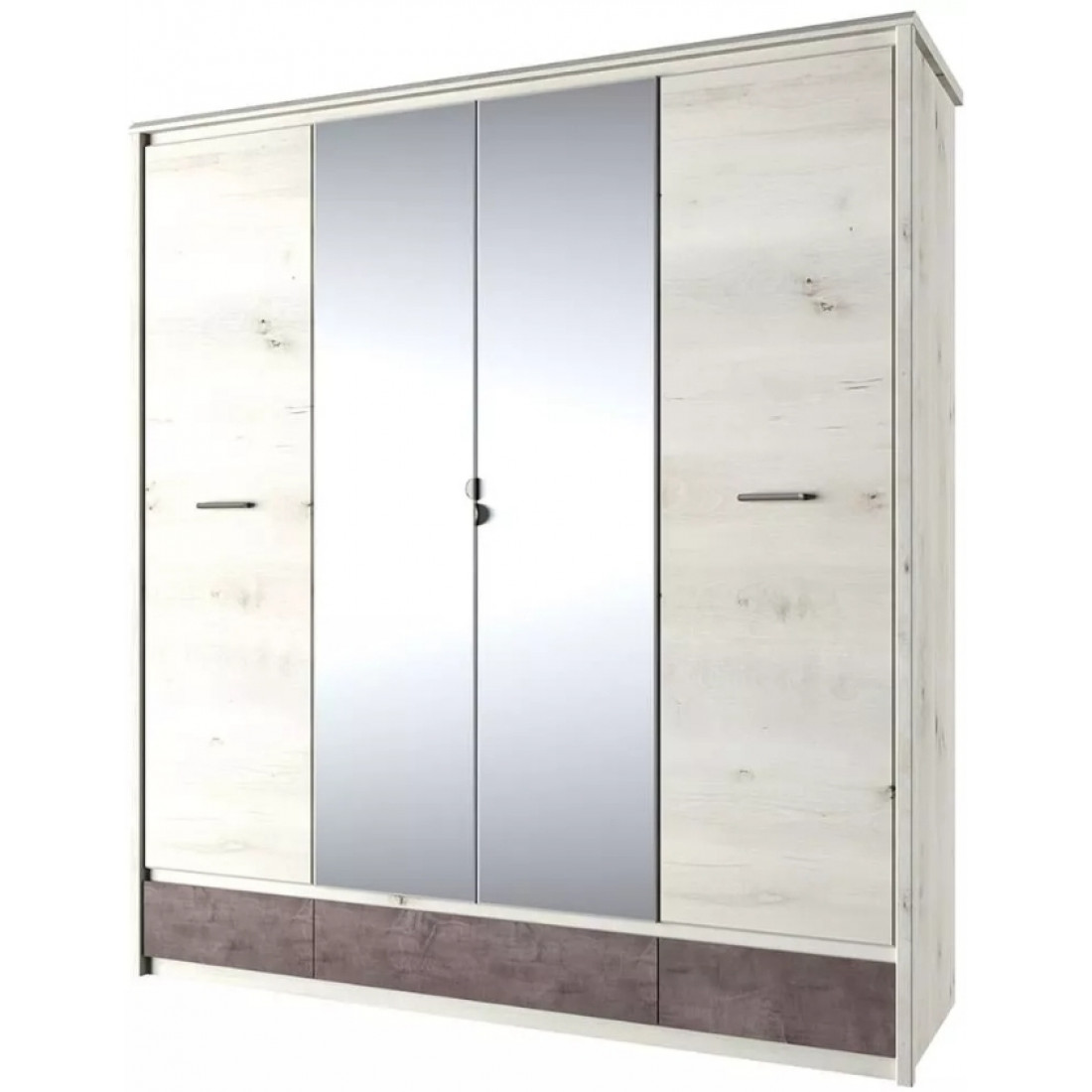 Четырехстворчатый шкаф для одежды с зеркалом Бьёрк 4DG3S Z — предмет современной коллекции в стиле Loft, где все элементы мебели выполнены в декорах ольха полярная и оникс с использованием уникальной структуры плиты.
