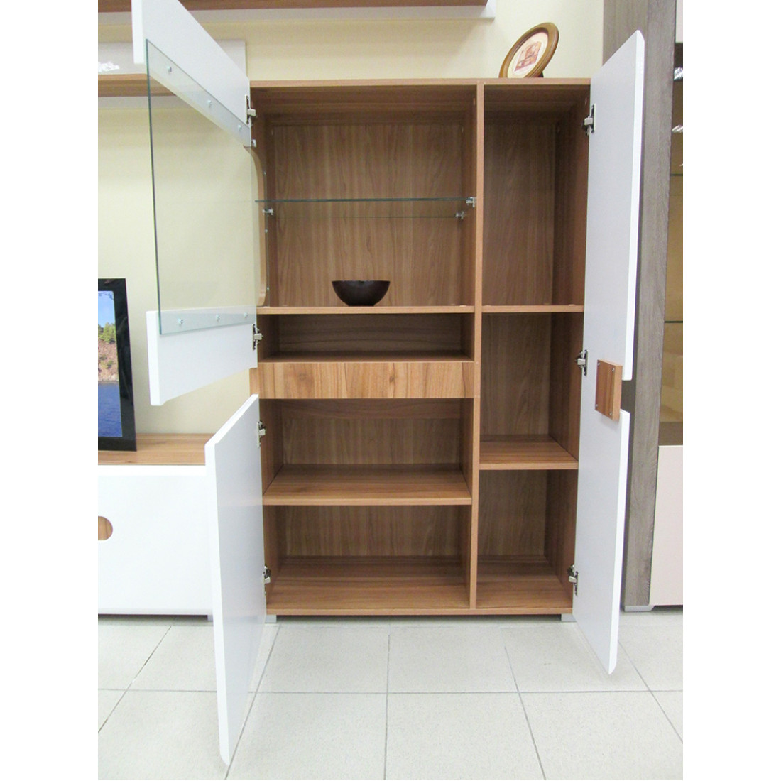 Двухстворчатый шкаф витрина для посуды в гостиную Леонардо МН-026-01/1 белый левый