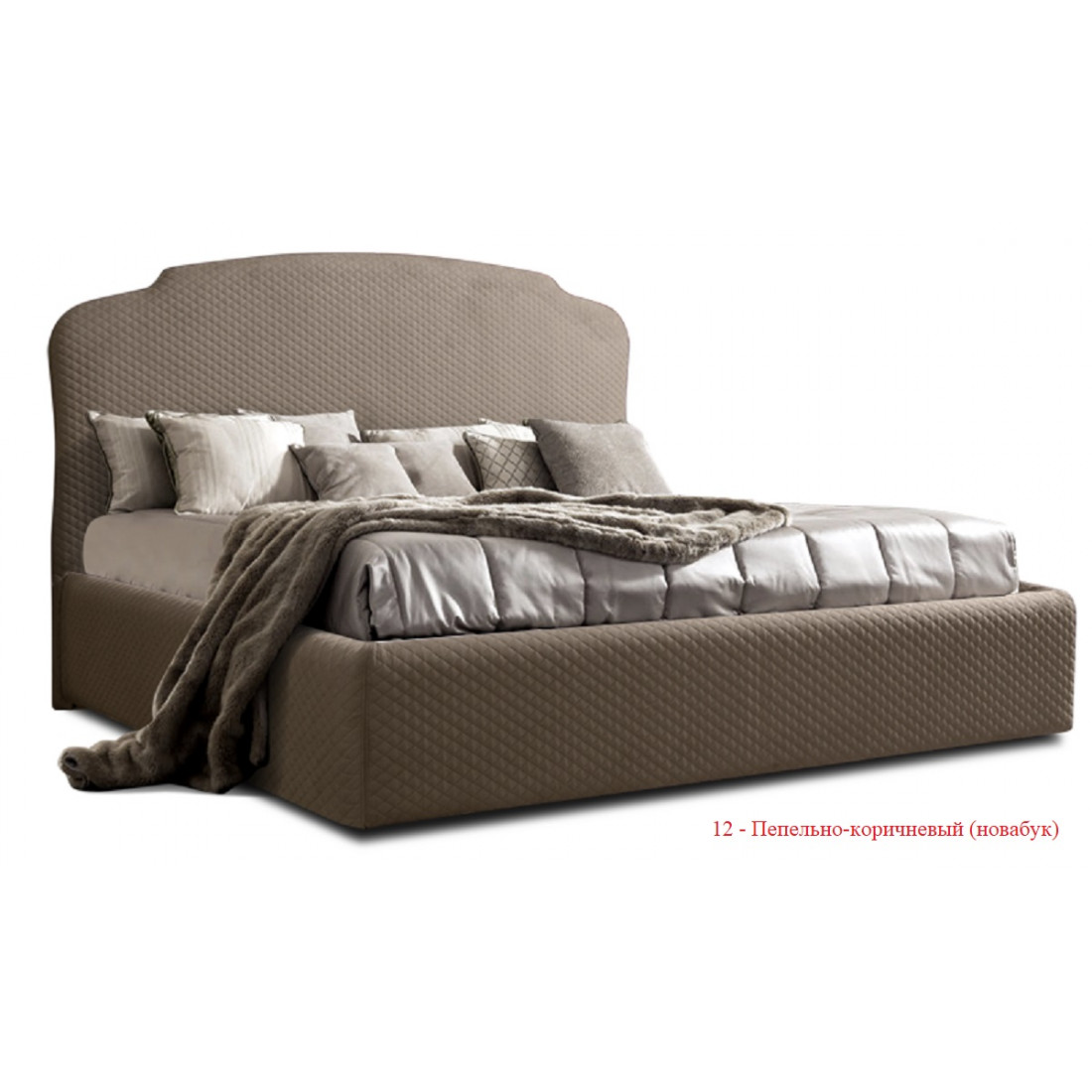 В этой кровати отсутствует изножье, есть только высокое изголовье фигурной формы. Если говорить о материале обивки, то это ткань из каталога итальянского производителя Novabuk.