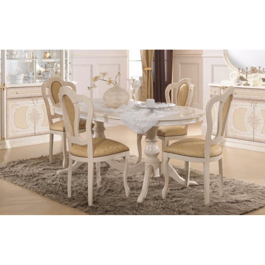 Гостиная Роза (беж) от фабрики ДИА мебель. Вся композиция выполнена в классическом стиле. Бежевый цвет в сочетании с глянцевым покрытием придает этой модели изящность и элегантность. Золотистый орнамент и аккуратные золотистые ручки на фасаде придадут чувства стиля. Мягкие и комфортные стулья помогут вам насладиться прекрасным вечером, после рабочего дня.