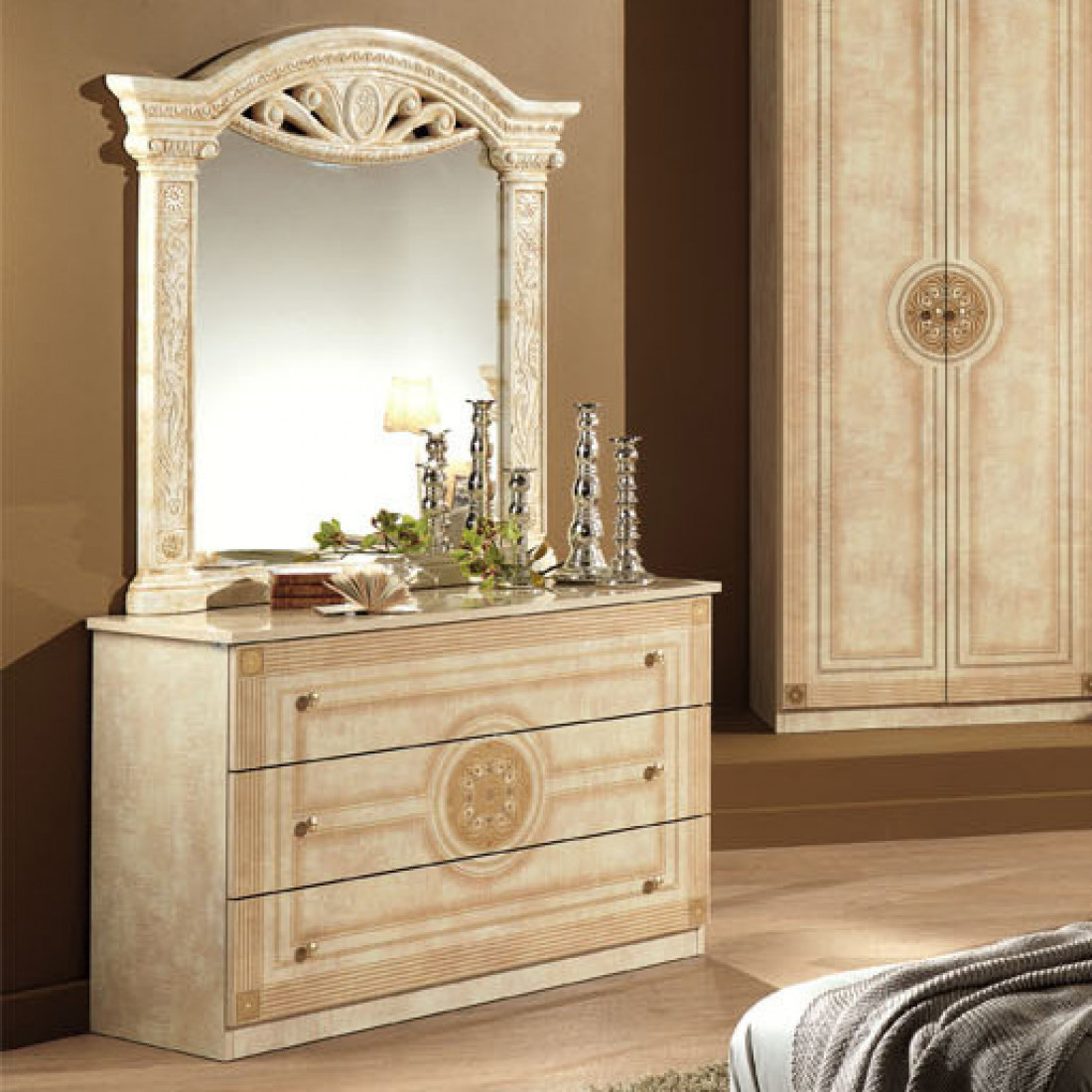 Комод с зеркалом Рома (беж) от Российской фабрики «ДИА мебель» выполнен в строгом, классическом стиле. Бежевый цвет в сочетании с глянцевым покрытием придает элегантность. Состоит из трех больших, вместительных полок и большого зеркала. Маленькие аккуратные ручки цвета позолоты придают атмосферу роскоши. Вся коллекция "Рома" предназначена только для истинных ценителей элегантного классического стиля.