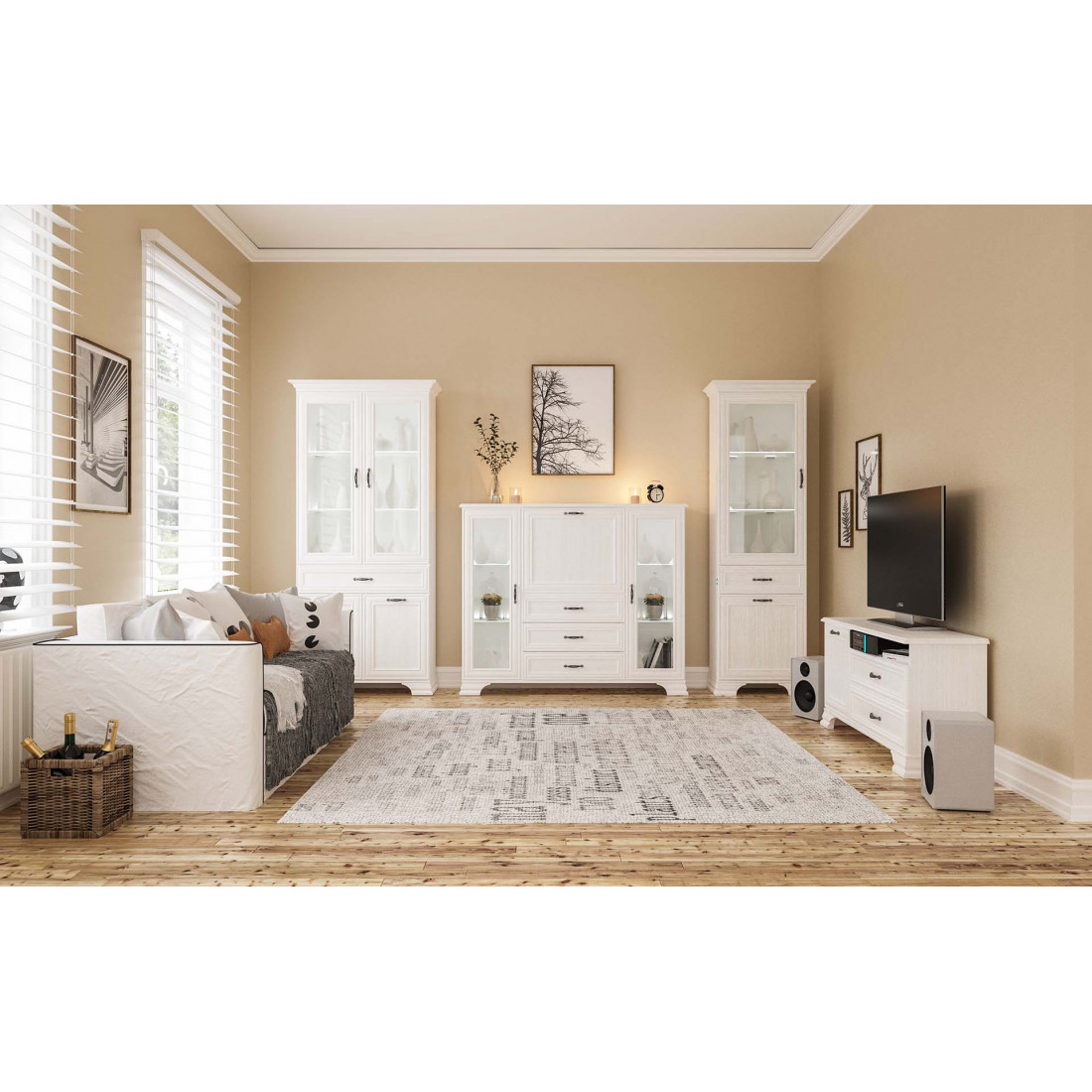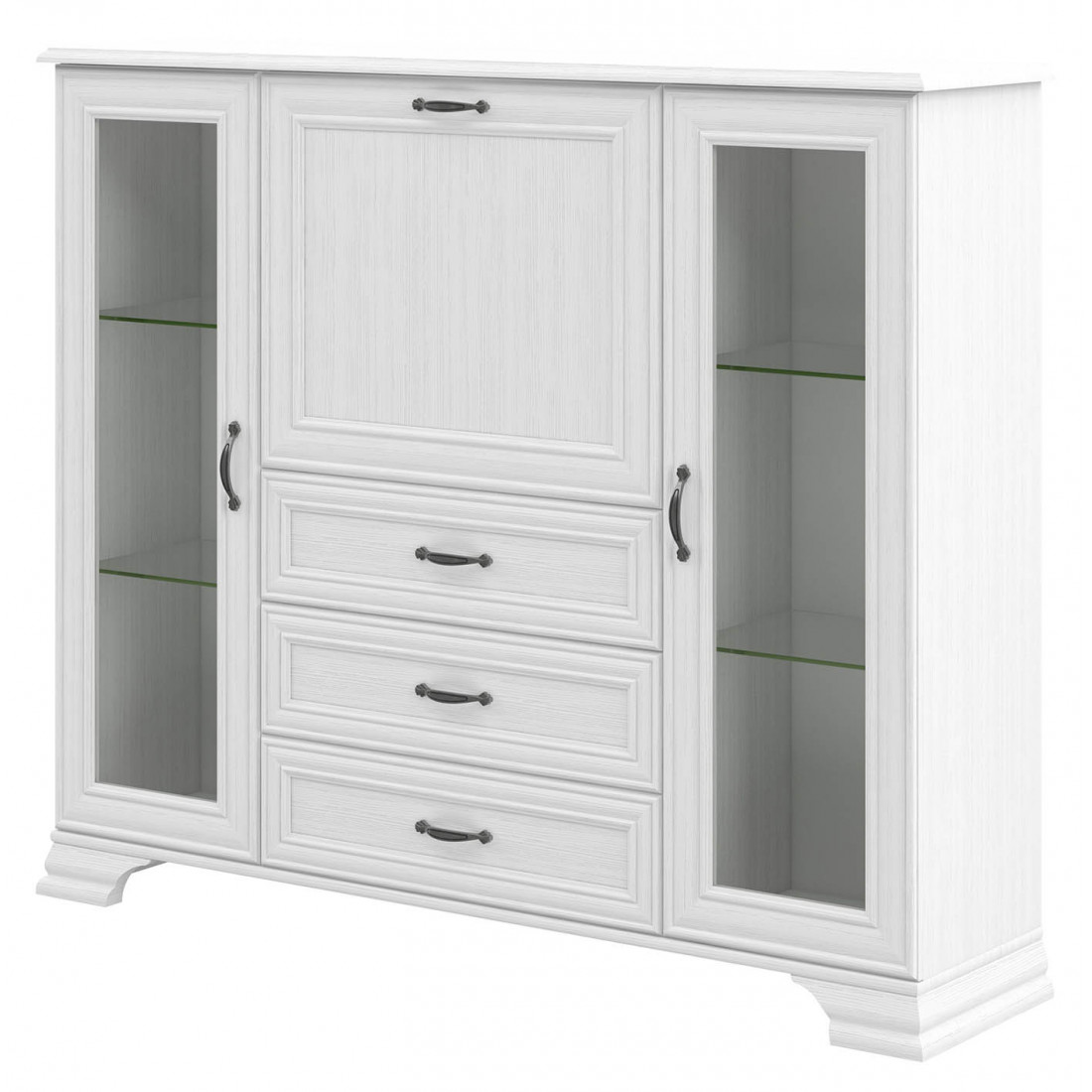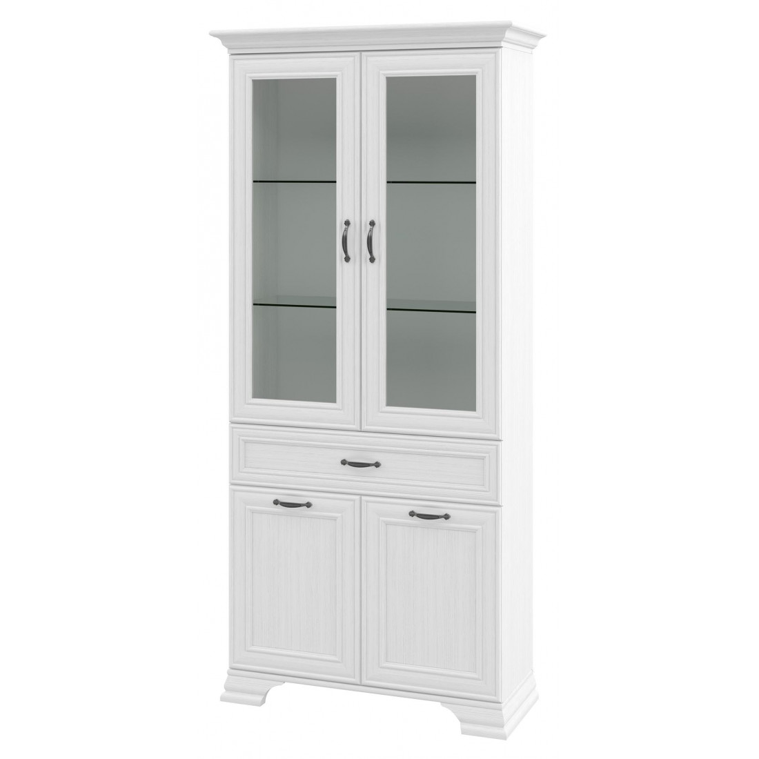 Мебель для гостиной Юнона от фабрики Мебель-Неман - это новинка 2019 года в классическом стиле с отделкой структурной фактуры, обрамленная рамочным фасадом, где металлические ручки выгодно подчёркивают стиль и изящество, всегда актуальна и востребована. Полки у шкафов-витрин и тумбы - стеклянные.