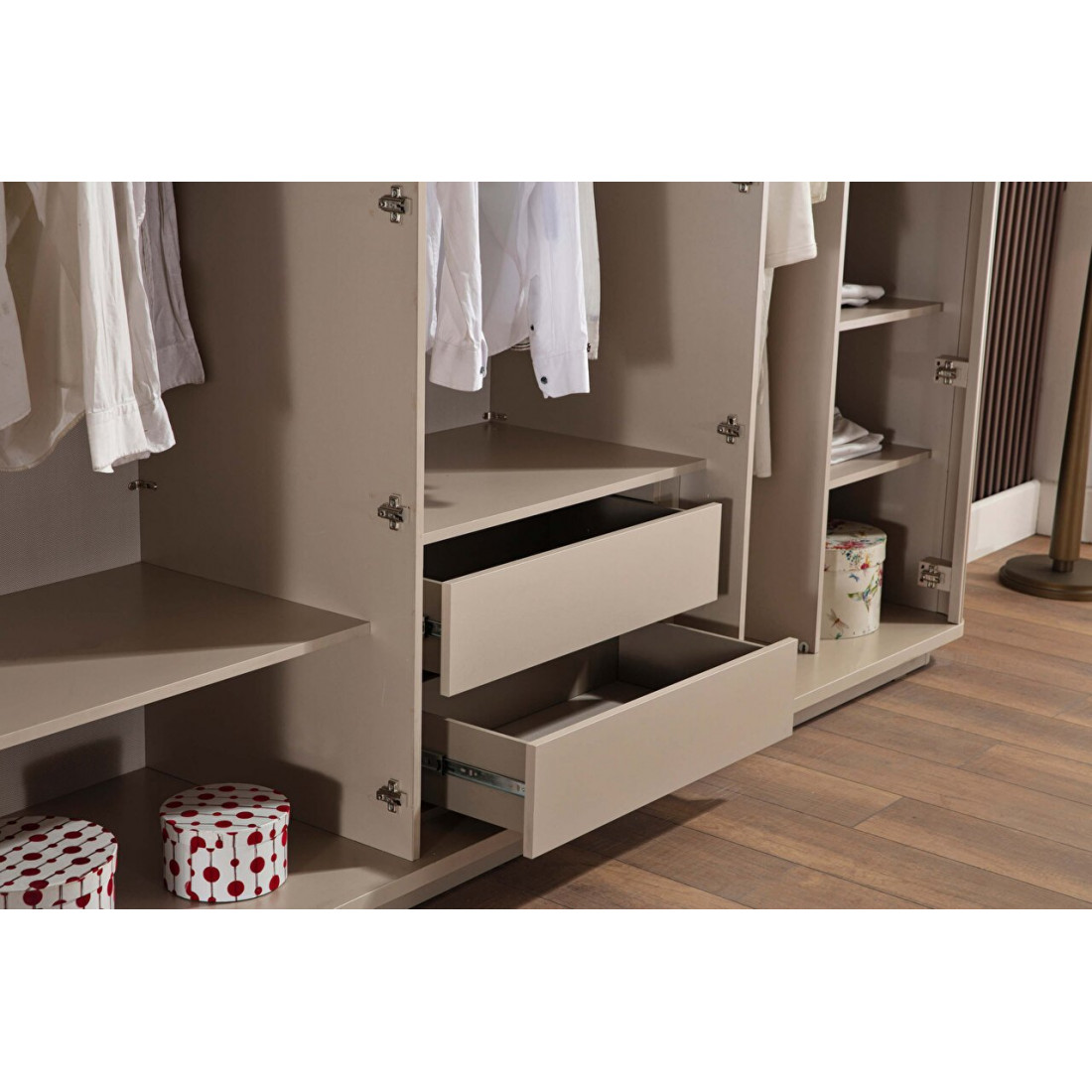 Три внутринних отсека, а так же глубина 660мм шкафа Санвито SANV-34 позволяет разместить достаточно большое количество полок для белья, штанг для одежды, а так же ящики для хранения! Плавное закрытие крайних дверок обеспечивается системой push-open .