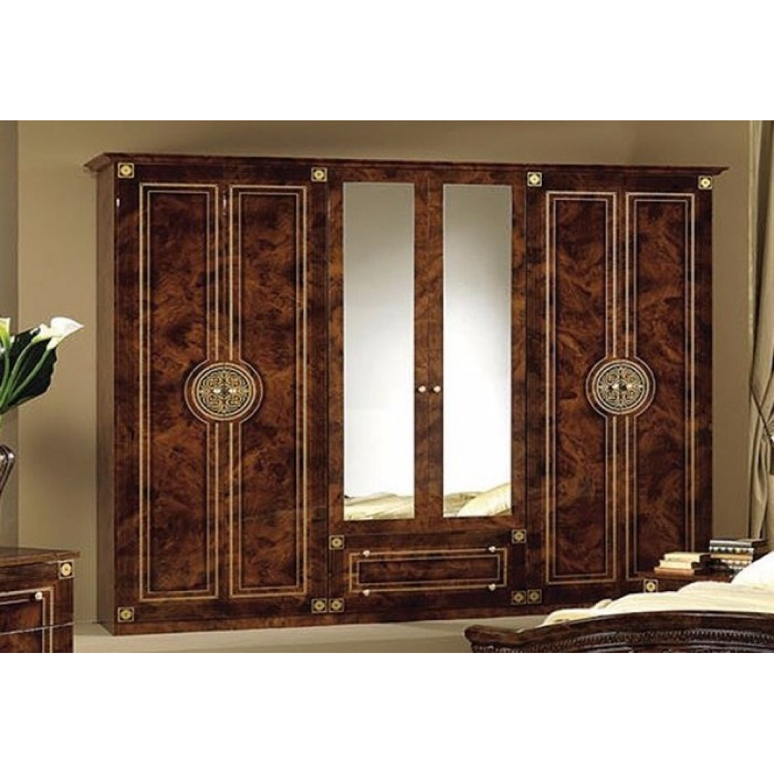 Спальня Рома (орех) композиция 2 от Российской фабрики «ДИА мебель» выполнена в строгом, классическом стиле. Ореховый цвет в сочетании с глянцевым покрытием придает элегантность. Такая спальня поможет Вам окунуться в атмосферу роскоши и комфорта. Большой шестистворчатый шкаф поможет с пользой заполнить место. Безшумные и плавно закрывающиеся дверцы шкафа и комода помогут с легкостью забыть о шуме по утрам. Вся коллекция "Рома" предназначена только для истинных ценителей элегантного классического стиля.