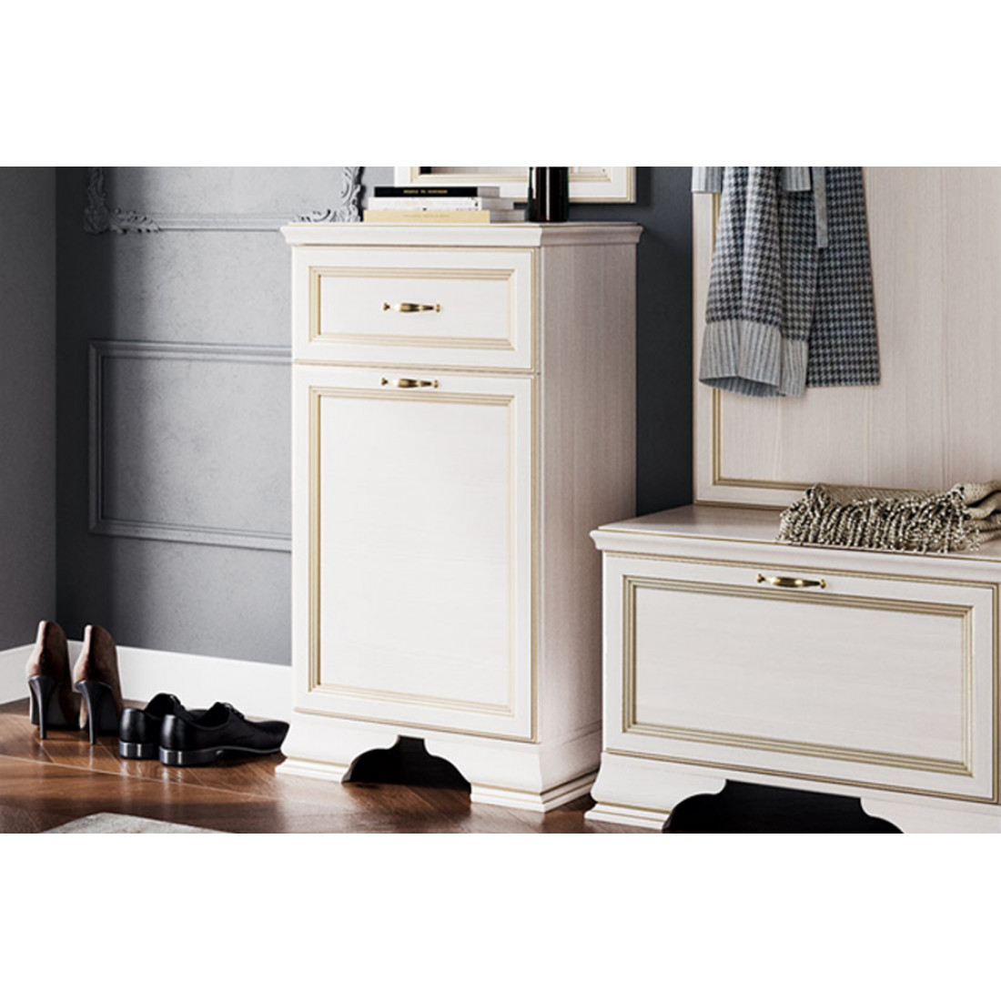 Коллекция производится в текстуре «бодега белый» с эффектом золотого патинирования. Облик «Сиены» дополняют рамочные фасады и карниз в классическом стиле, а также эффектные опоры из МДФ. Мебель комплектуются металлической лицевой фурнитурой премиум-класса в цвете «старая бронза» и надежной крепежной фурнитурой.