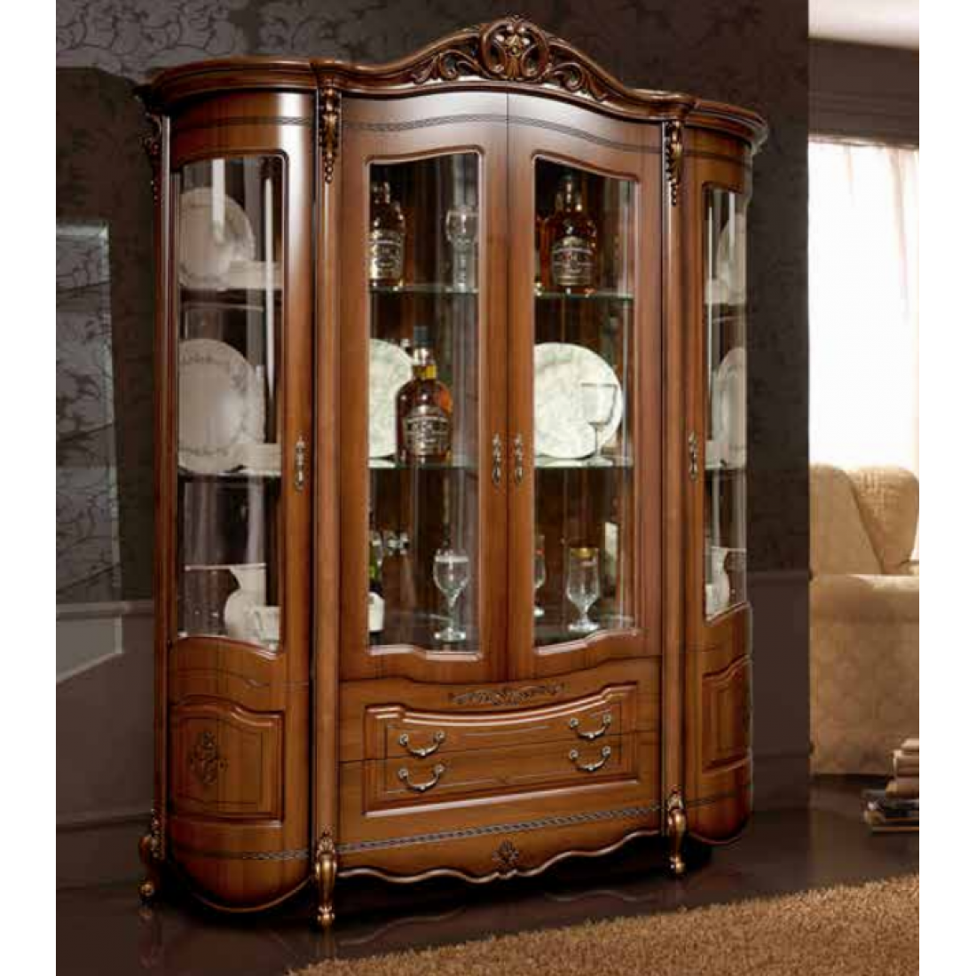 Шкаф-витрина четырехдверная Аллегро 1 (орех) – данная модель сделает вашу гостиную неповторимой и нарядной. Ее стеклянные дверцы и зеркальный корпус придадут комнате светлую атмосферу, а стеклянные полки для посуды сделают эту витрину легкой и воздушной даже не смотря на ее мощный с первого взгляда фасад. Такая витрина подчеркнет классический стиль и послужит показателем богатства и престижа хозяев дома.